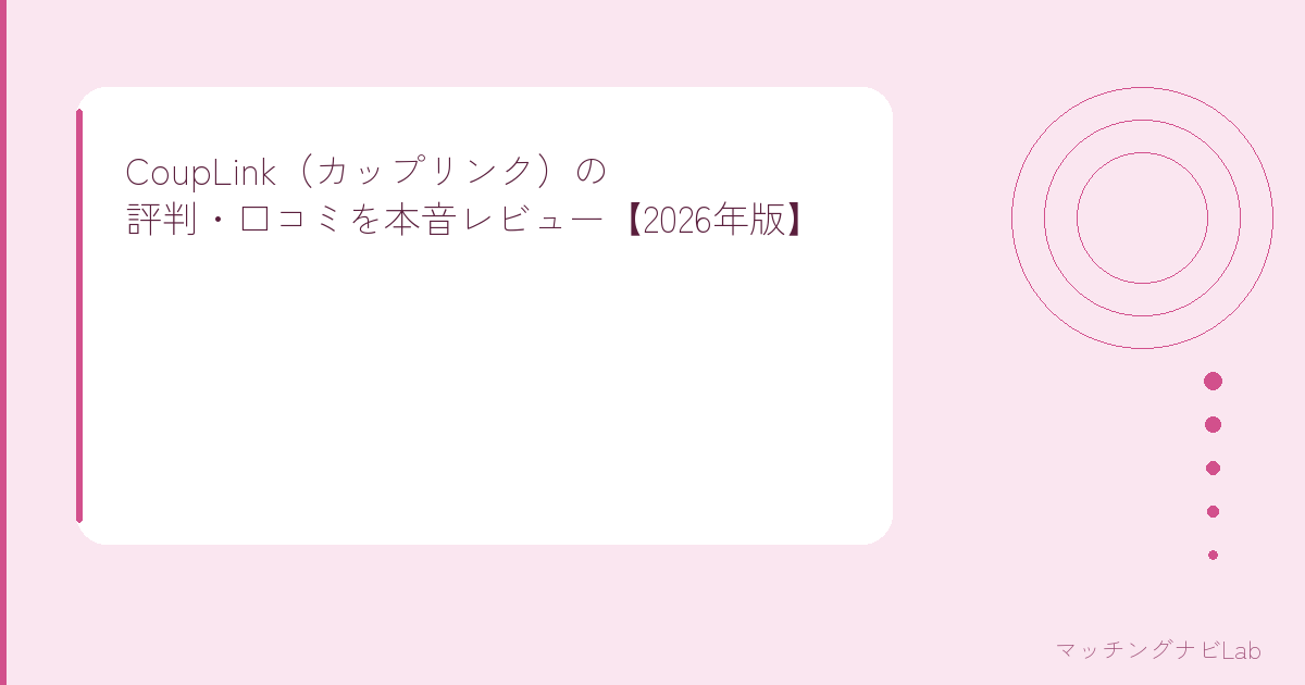こんな疑問を持ってる人に向けて、この記事ではCoupLinkの評判・口コミを徹底的に調査したよ。結論から言うと、CoupLinkは街コンジャパンと連携したユニークなマッチングアプリで、リアルイベント×アプリのハイブリッドな出会いができるのが最大の強み。ただし会員数はまだ発展途上という面もある。