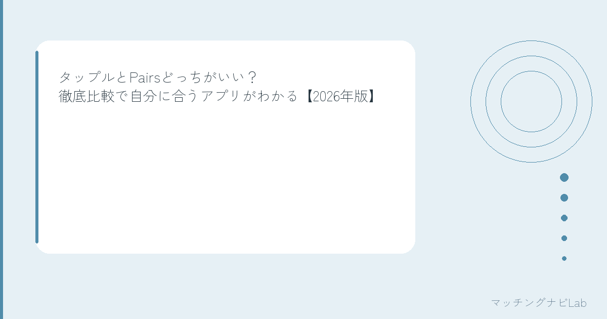 マッチングアプリの二大人気アプリで迷ってる人、めちゃくちゃ多いよね。結論から言うと、「気軽にサクサク出会いたい」ならタップル、「じっくり相手を探したい」ならPairsがおすすめ。この記事で詳しく比較していくよ。